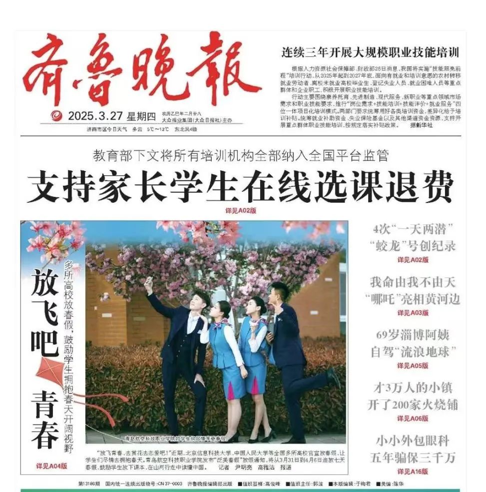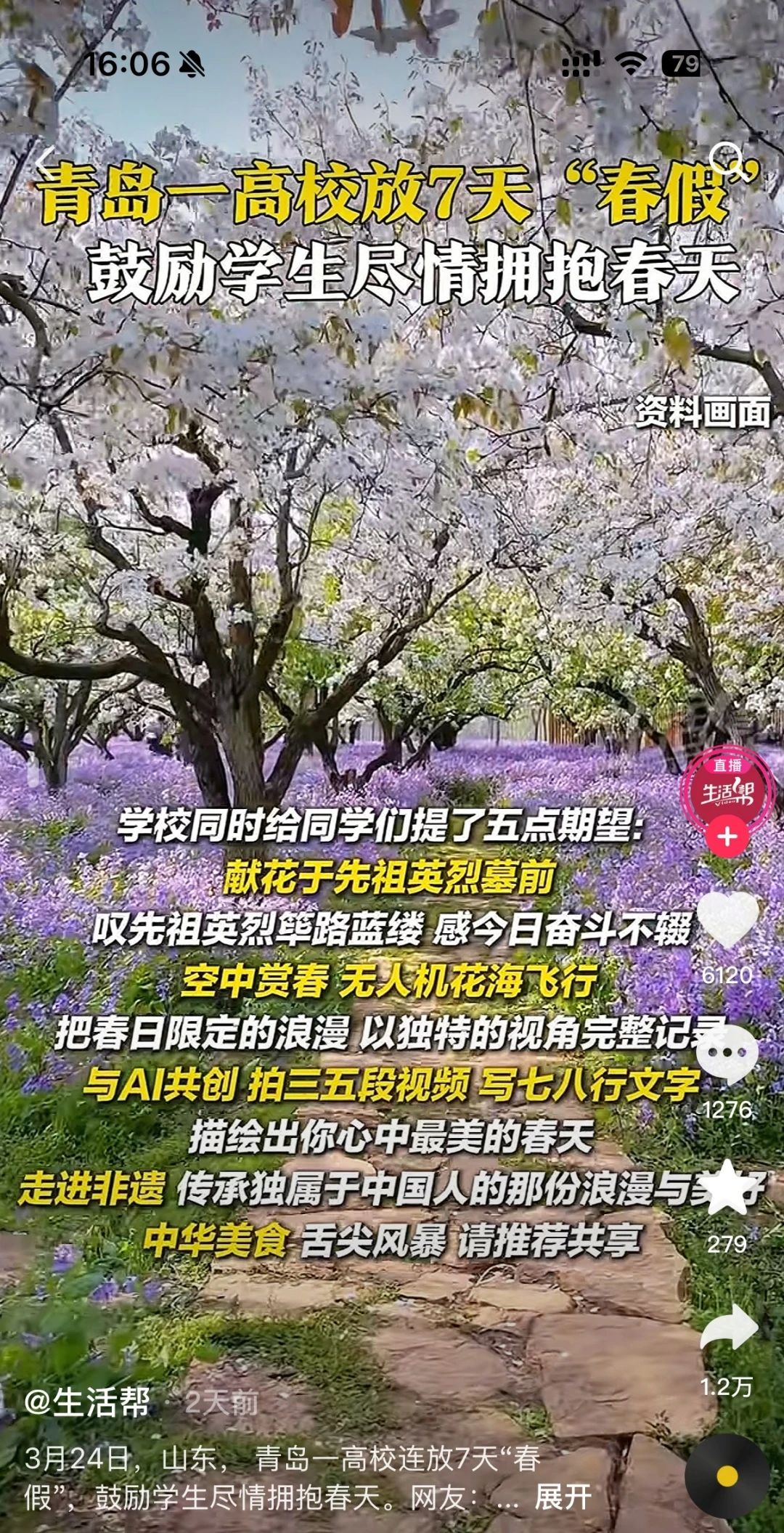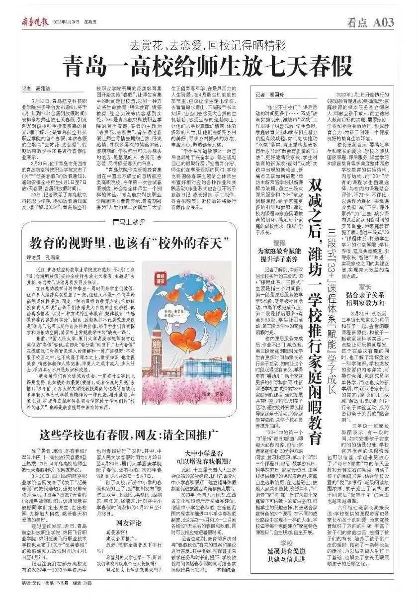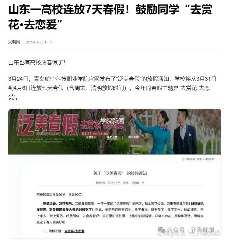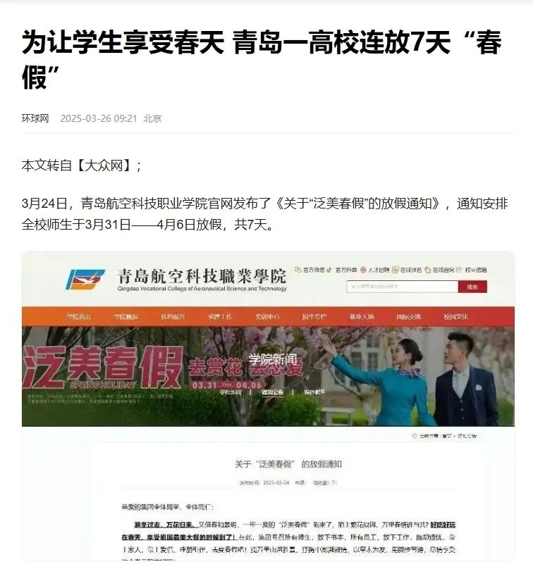 青岛航空科技职业学院今年在公布春假安排时,还特地配上了主题词“去赏花·去恋爱”,教育者们通过实践,将春假转化为一场成长的实验。