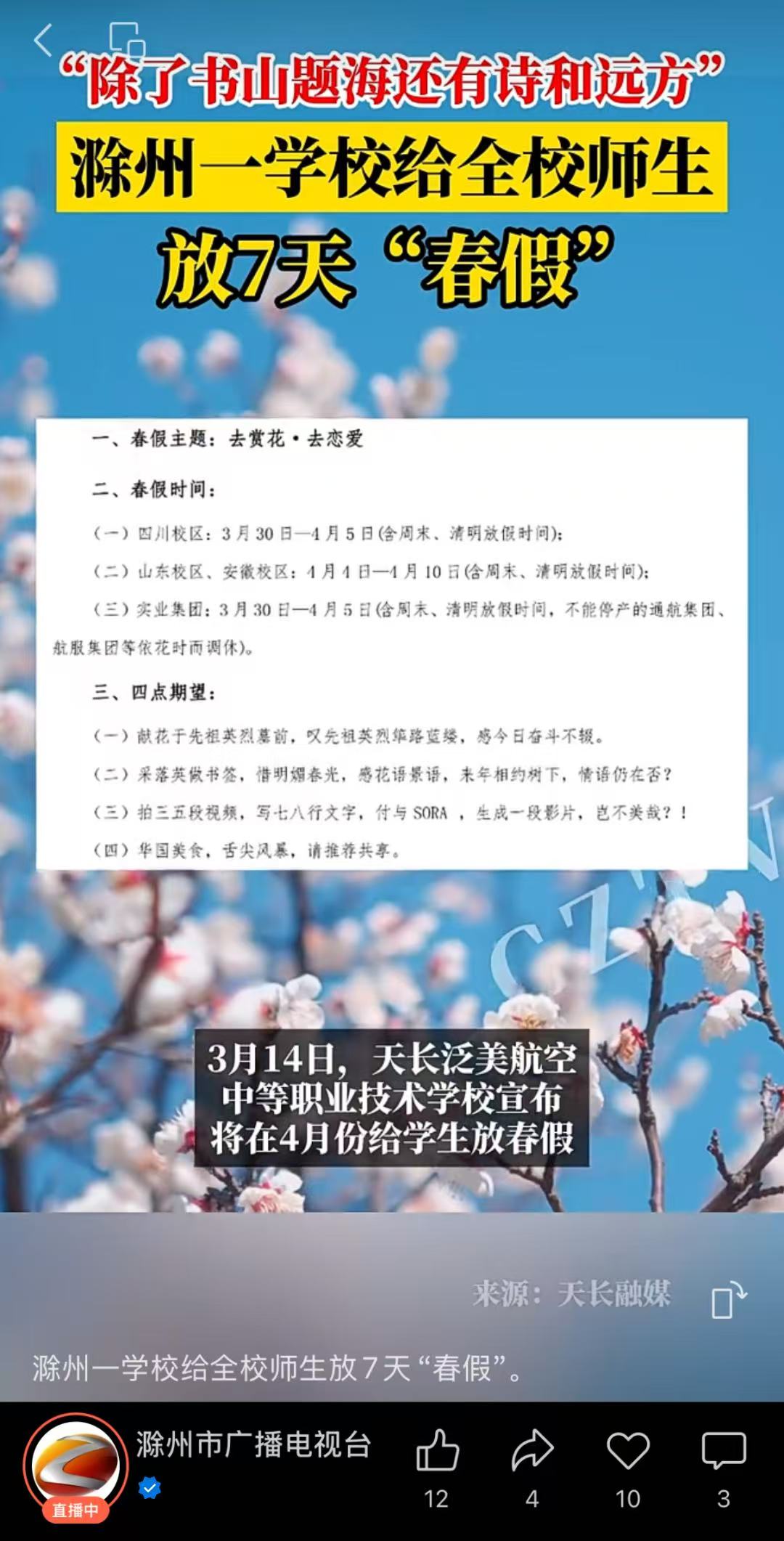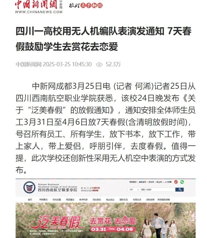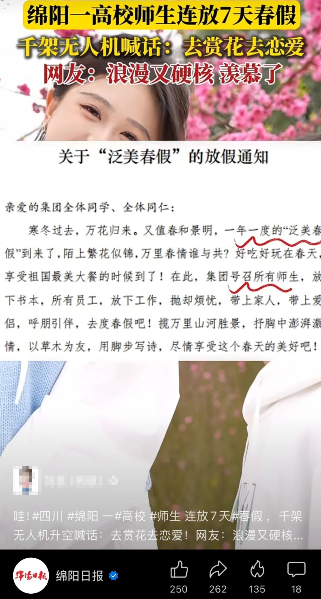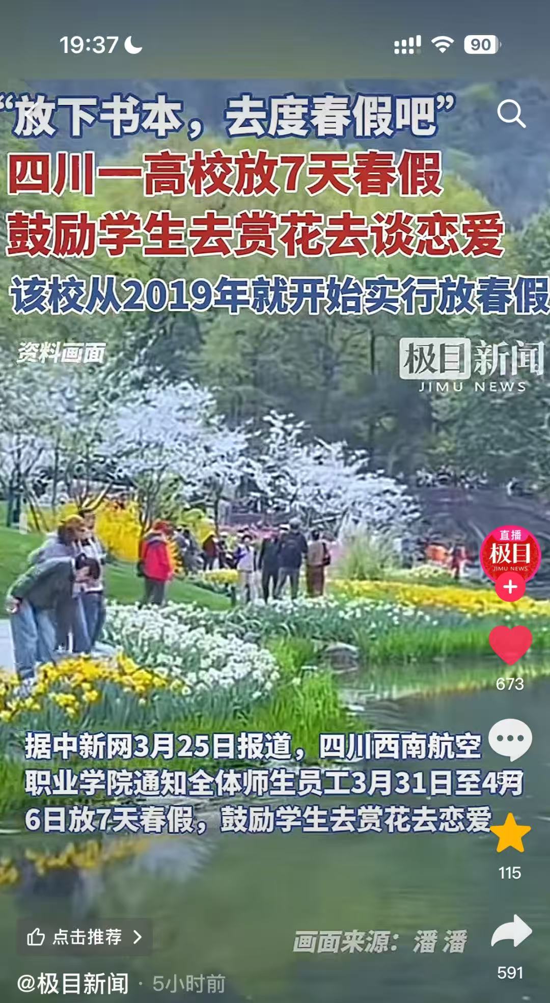 “学校放春假,让大家去游玩,去恋爱”的消息获央视新闻周刊的关注,央视主持人白岩松硬核喊话,“春光正好,众多学校是不是也抄抄这份作业”,呼吁其他学校“抄作业”。