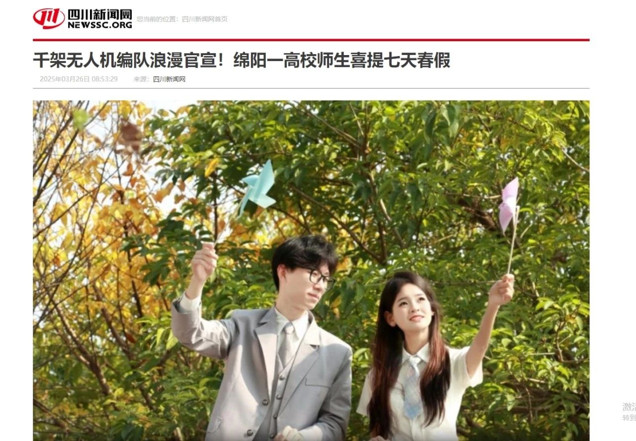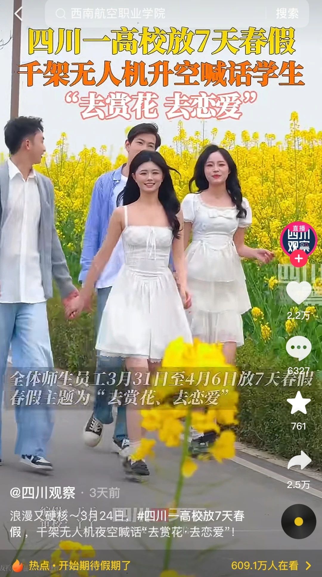 别人家的大学,又双叒叕放春假了!“学校通过无人机专业学生,通过无人机表演发布放假通知,既秀了专业实力,又狂撒青春糖分,本身就是一堂‘硬核实践课’。会操作无人机的技术咖,懂赏花恋爱的有趣灵魂,正是时代需要的复合型人才。”
