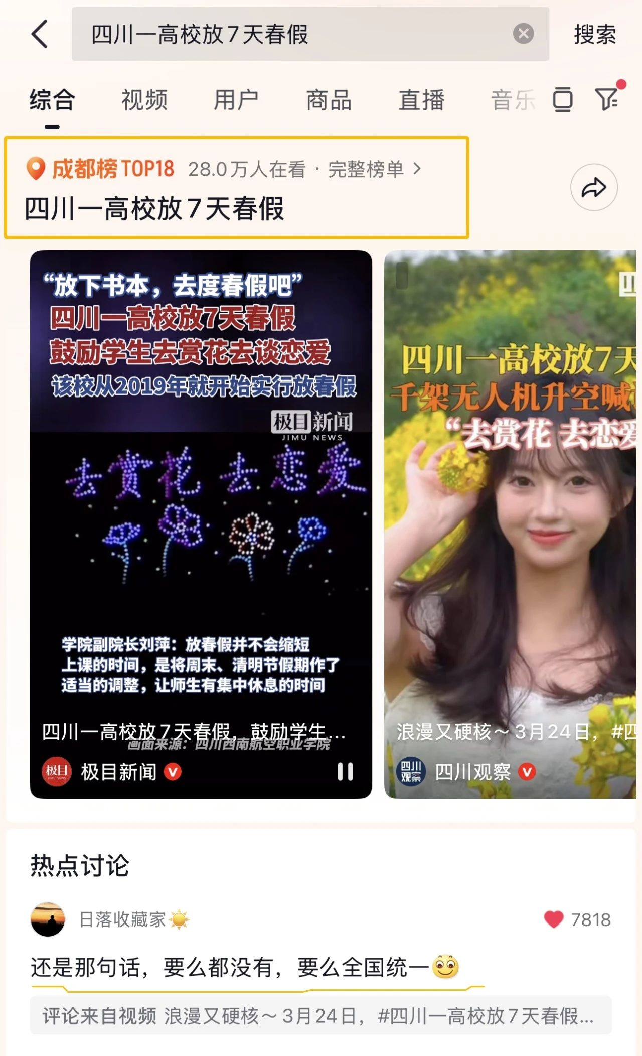 “泛美春假”“高校放7天春假鼓励赏花恋爱”的话题,持续发酵,在多个新闻客户端的头条推送、还登上了各地区抖音、微博、微信搜索等实时热度榜单