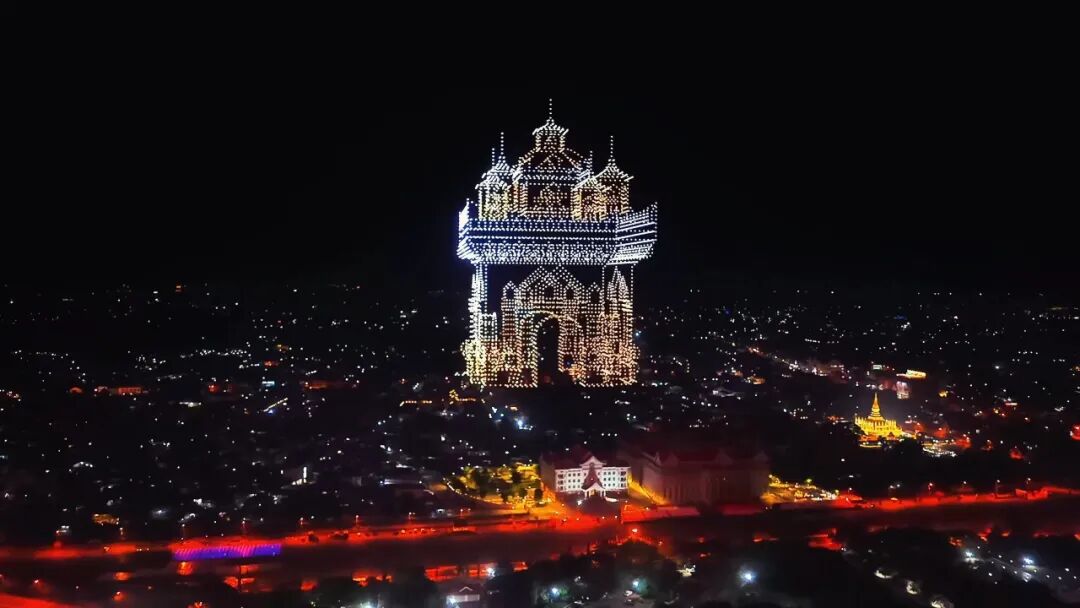 在长达40分钟的大型焰火与无人机联合表演中,无人机编队以毫米级精度,依次变幻出多组代表老挝历史文化与发展成就的图案。这场表演超越了单纯的视觉展示,通过深入挖掘老挝的国家符号与文化印记,将每一帧光影转化为讲述老挝故事的载体,实现了科技手段与文化表达的深度融合,赢得现场观众的阵阵赞叹。